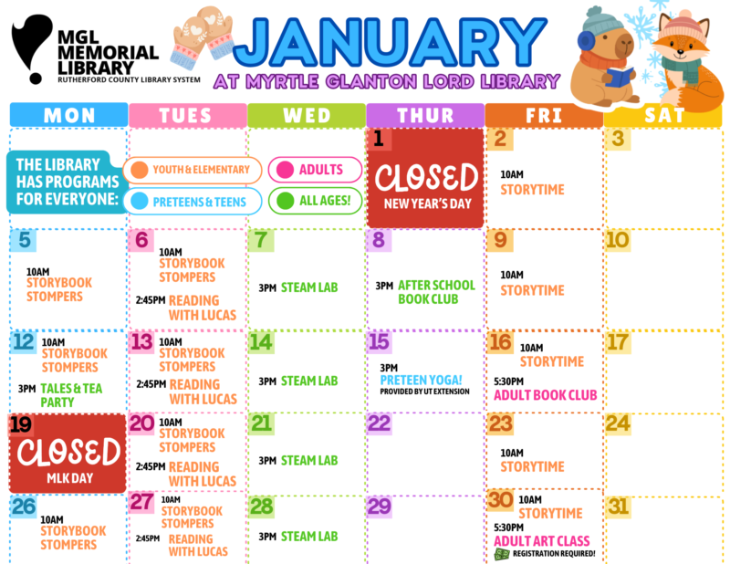 Please note: There are no Storytimes or STEAM Lab events during December or May.