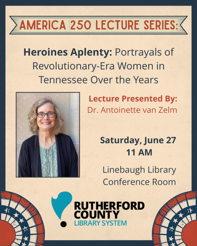 Join us on Saturday, May 30, at 10 AM at Linebaugh Library for our America 250 Lecture Series and Revolutionary Rutherford traveling exhibit premiere. MTSU History professor, Dr. Lynn Nelson, will present, Tennessee’s American Revolution, which will take place upstairs in the Conference Room. Afterwards, we’ll have the Revolutionary Rutherford exhibit premiere with food and drinks to enjoy! Join us for some history and learning, and let’s celebrate America 250 together!
