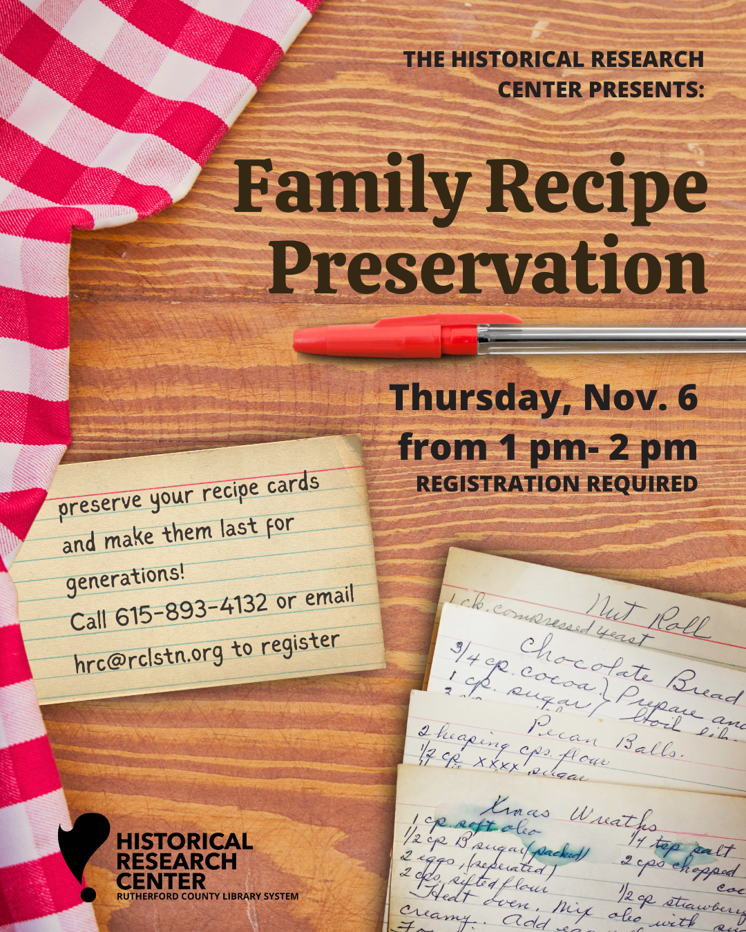 Register by calling (615) 893-4132 or emailing hrc@rclstn.org The Historical Research Center is holding TWO special events in November for families and individuals to learn how to make sure their recipe cards last for generations to come AND how to use the cards alongside other family recipes to create a book that can be cherished and shared with loved ones. You are not required to attend both events, but registration is required to attend!