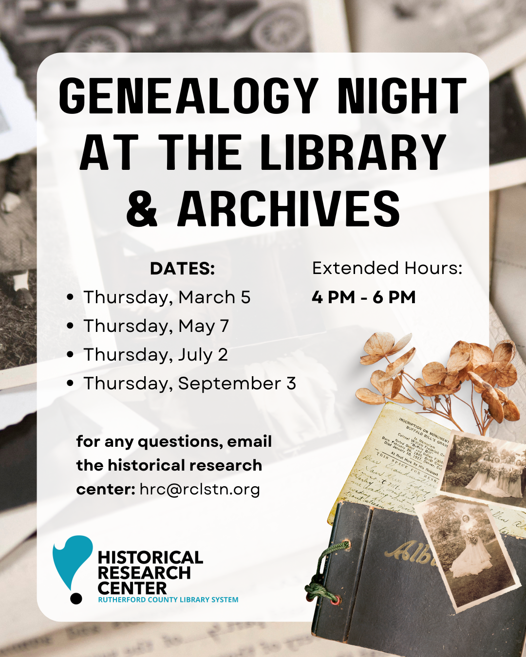 Interested in genealogy but can’t visit during normal hours? For one night every other month, we’re extending our hours to 6 PM to help you with your genealogy questions and goals!