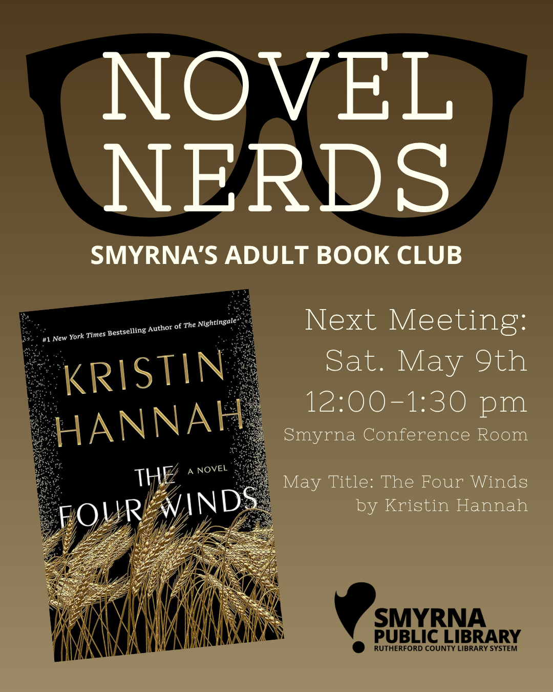 For May, Novel Nerds will be meeting to discuss The Four Winds by Kristin Hannah. You can find this book in our collection at explore.rclstn.org as a physical copy, large print and CD book. It is also available as an ebook and audiobook on Libby.