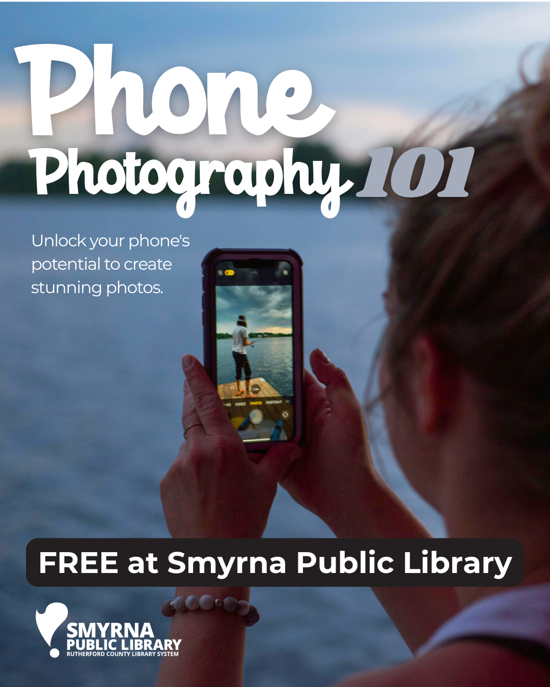 New Year, New Skill! Unlock the full potential of your smartphone to capture stunning photographs through expert guidance on camera settings, composition techniques, and editing strategies. Become a master photographer and join us at Smyrna Public Library for Phone Photography 101. This is an all-ages event; however, any child under the age of 13 must have a parent present and some knowledge of smartphones in order to attend.