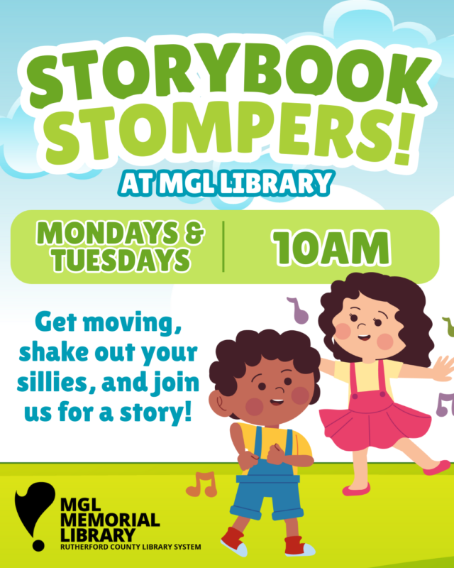 Join us for Storybook Stompers at MGL Library! Every Monday and Tuesday at 10am, be ready to get moving, shake out your sillies, and listen to a story!