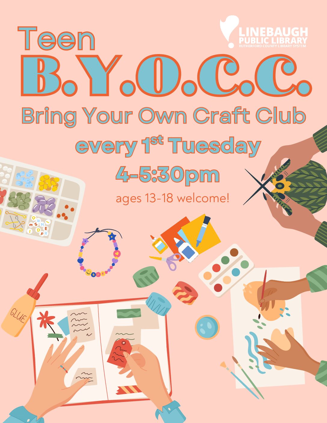 Come get your craft on with us every 1st Tuesday here at Linebaugh at our teen BYOCC–Bring Your Own Craft Club! We meet in the 1st floor clubroom from 4-5:30pm and welcome crafters of all proficiencies and mediums. Whether you’re a visual artist, a jewelry maker, a fabric artist, or are making something totally new, we want you to come hang out & meet other teen crafters for a chill social.