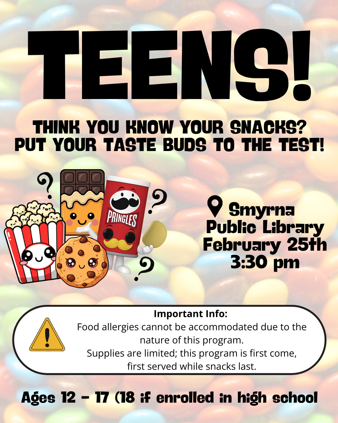 Join us @ Smyrna Public Library 3:30pm for our Teen Taste Test Challenge.