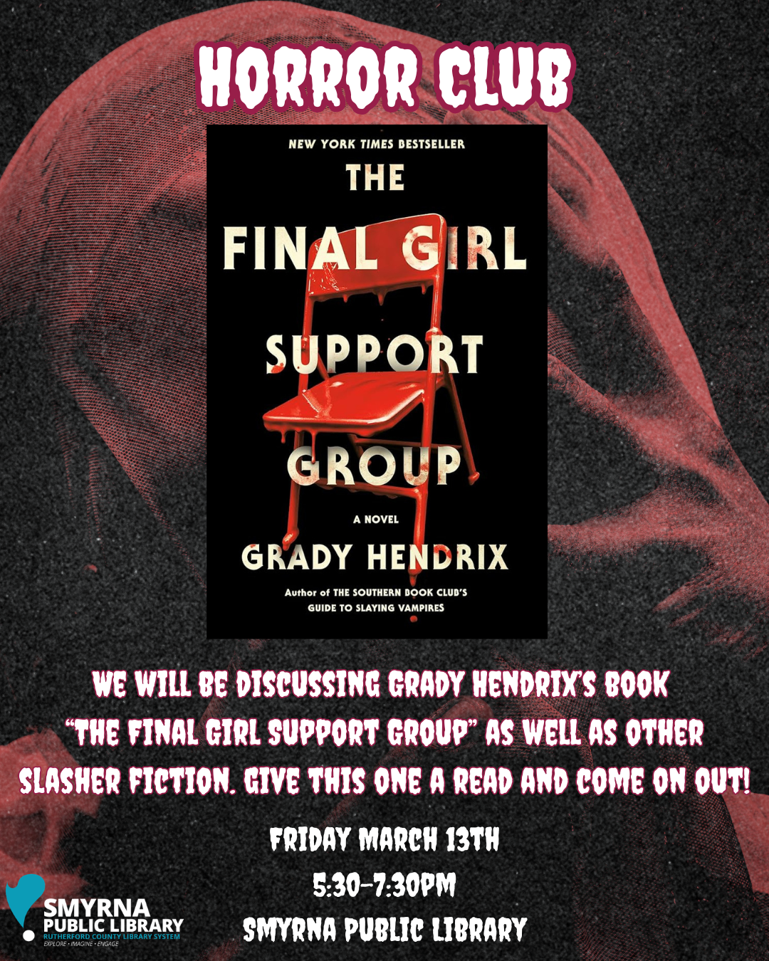 A New club to read, watch, and discuss all things horror! We will be discussing Grady Hendrix’s book “The Final Girl Support Group” as well as other slasher fiction. give...