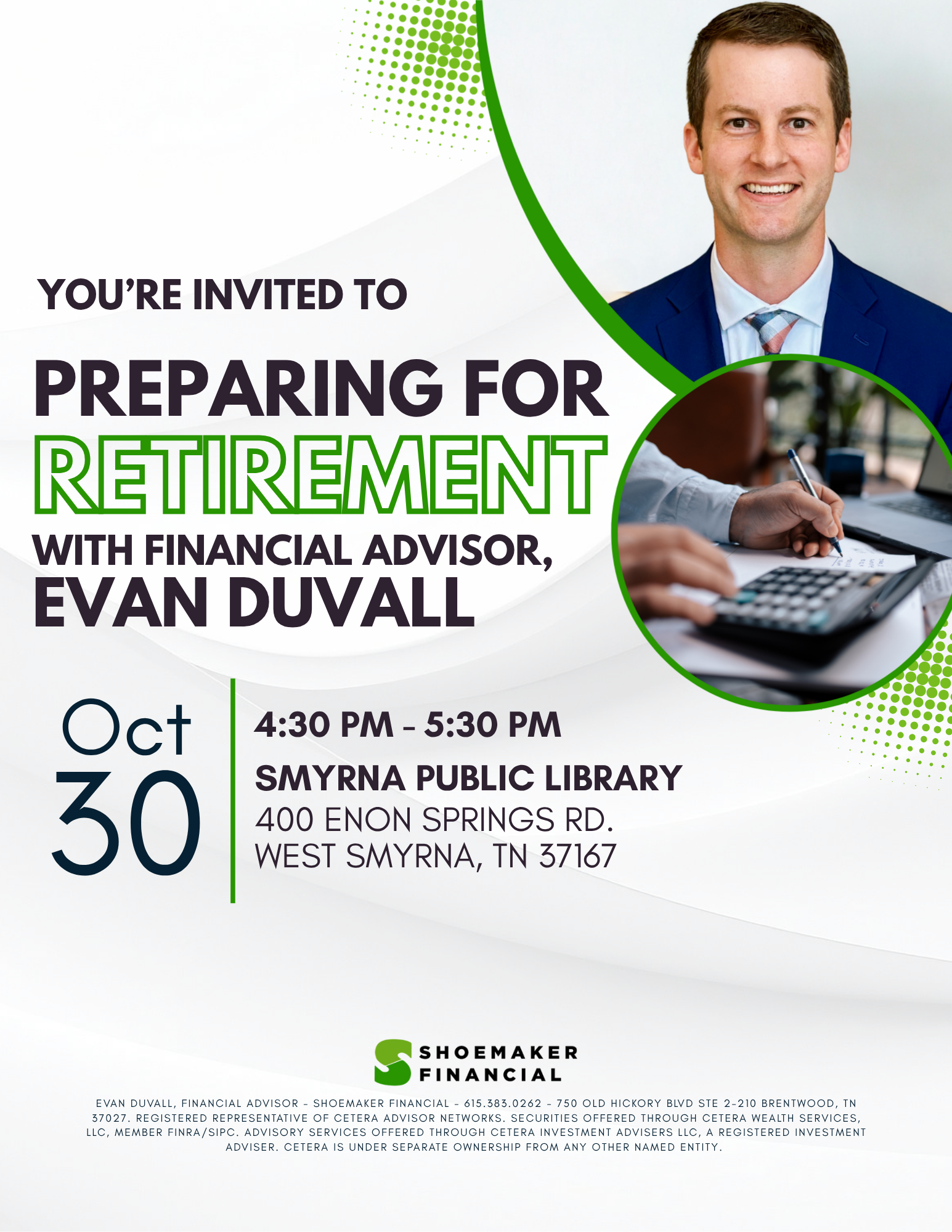 This event is free and open to anyone looking to begin preparing for retirement. Sponsored by Evan Duvall of Shoemaker Financial.