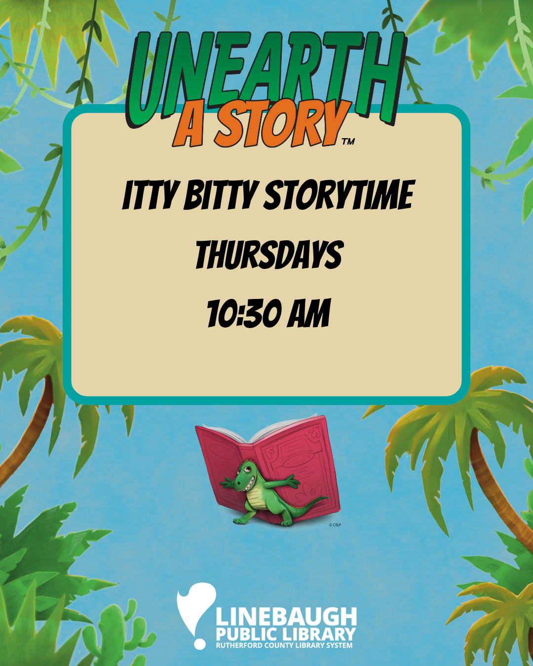 For our “Unearth a Story” summer reading program, we’re sharing stories about dinosaurs, history, and curiosity. Itty Bitty Storytimes are intended for children ages 0-23 months and feature a mix...