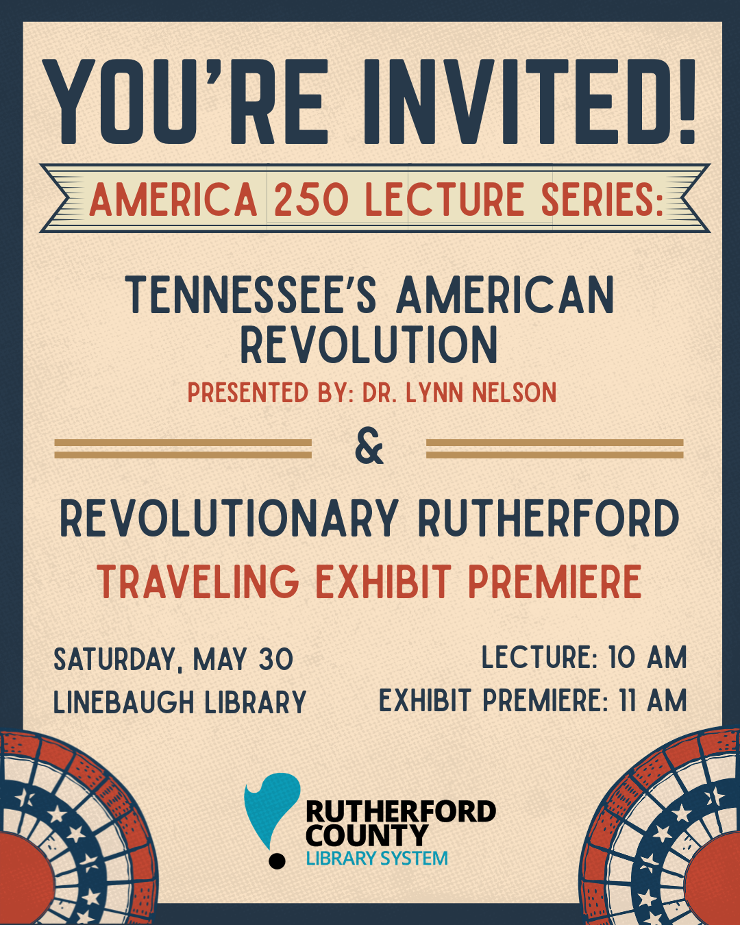 Join us on Saturday, May 30, at 10 AM at Linebaugh Library for our America 250 Lecture Series and Revolutionary Rutherford traveling exhibit premiere. MTSU History professor, Dr. Lynn Nelson,...