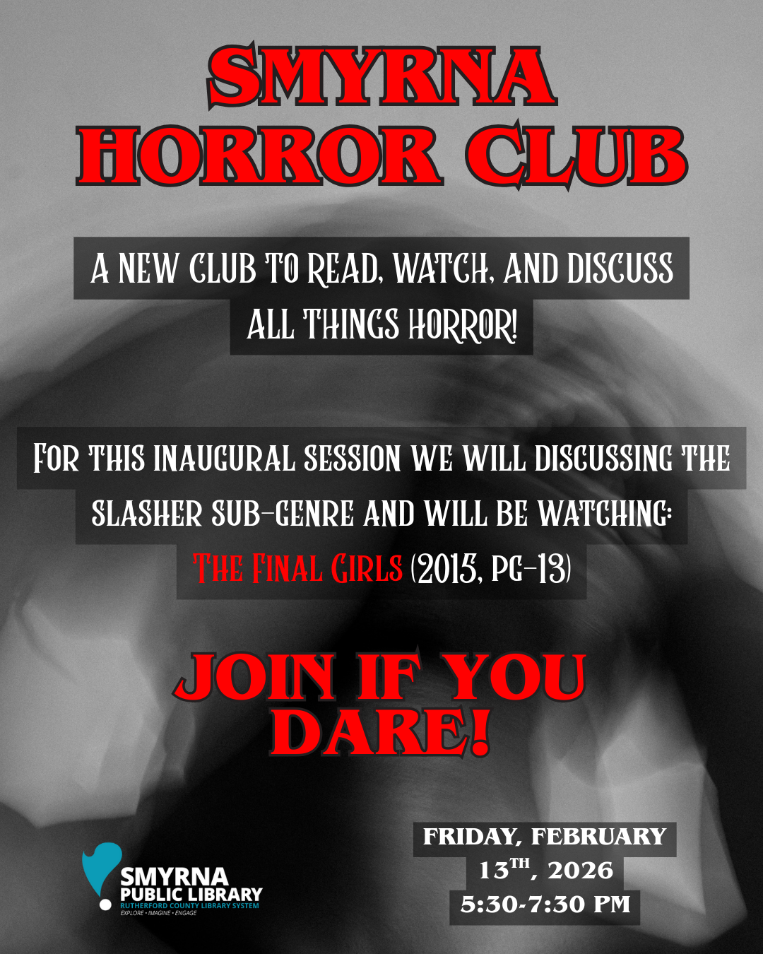 Join us at the Smyrna Public Library for the inaugural meeting of the HORROR CLUB! More information to come