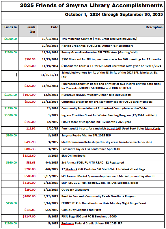 Friends of Smyrna Public Library, also known as FOSL, was established in 1987, and is a 501 (c)(3) non-profit organization whose object is to promote the interest and welfare of Smyrna Public Library as a cultural, educational, and recreational asset to the town of Smyrna and Rutherford County, including contributing to reading engagement in the local community via donations of books and educational materials to non-profit, community and governmental agencies.
