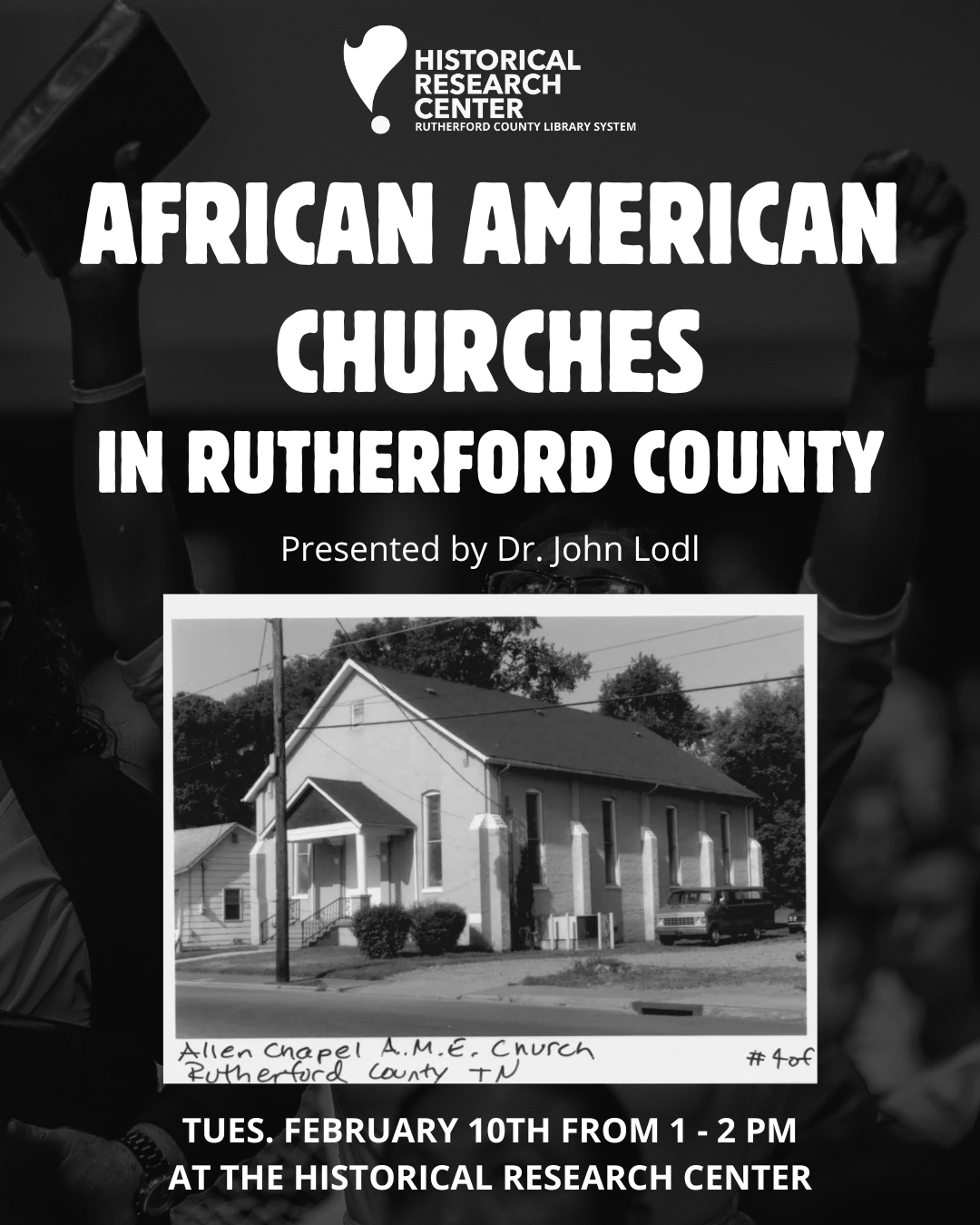 Presenter, Dr. John Lodl, will be giving a talk about their dissertation on African American Churches in Rutherford County and we invite the community to attend. It will be held in-person and through Zoom. No registration is required. This event is free and open to the public. To attend virtually, please email HRC@rclstn.org for the...