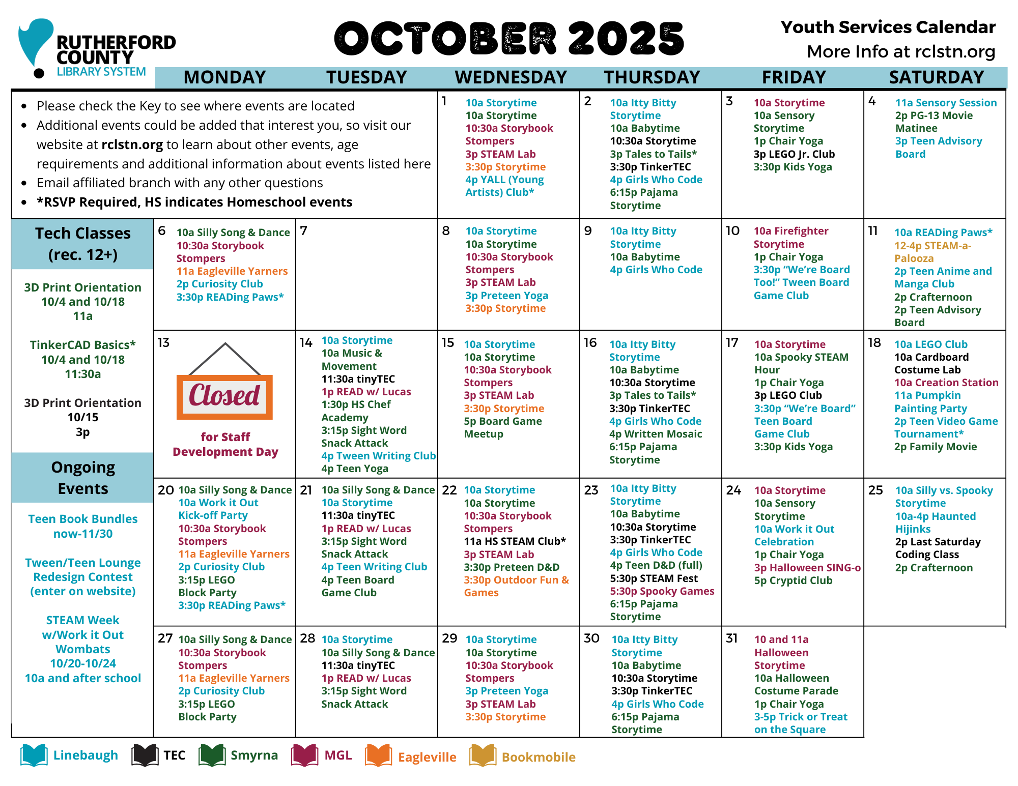 Monthly Calendar for Youth Services (all branches)