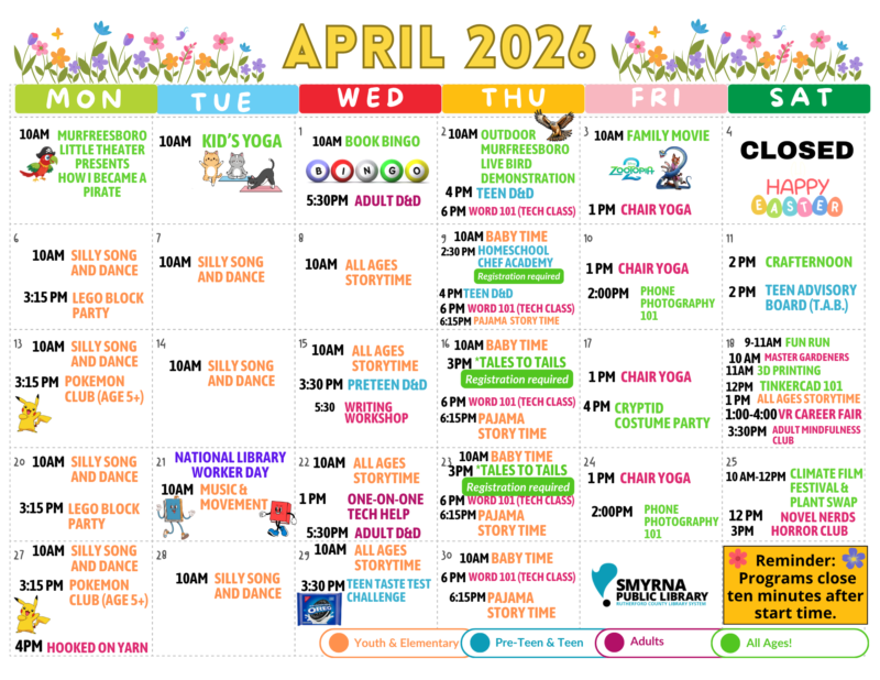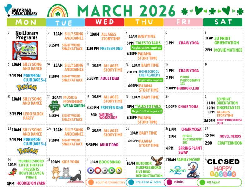 Follow us on social media to learn more about all of Smyrna Library’s events! @RCLSTN